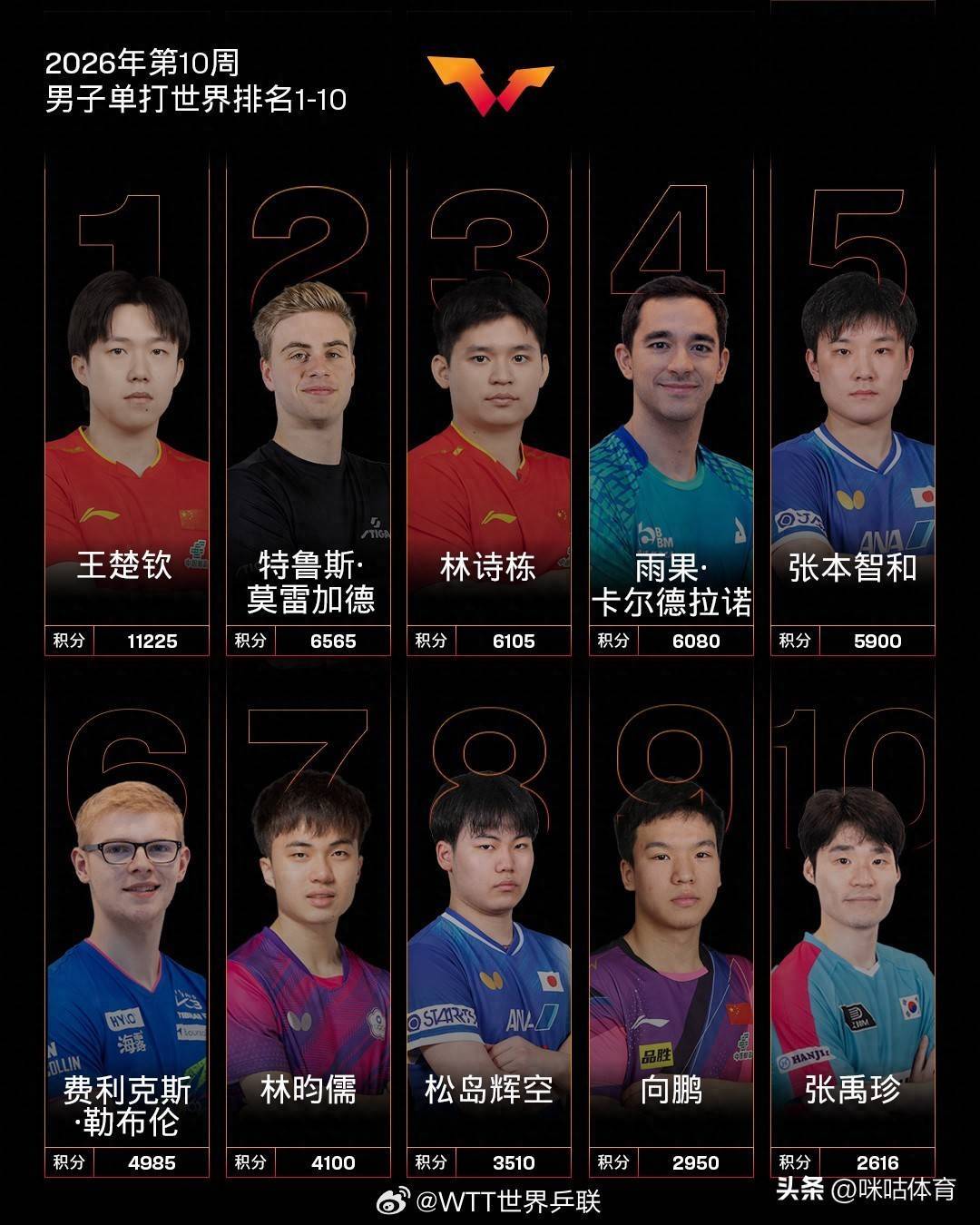 WTT新加坡大满贯赛事驱散后美洲买球网体育信息,海外乒联更新最新一期男单天下排名,中国选手合座弘扬亮眼,梯队气势稳居天下前哨。