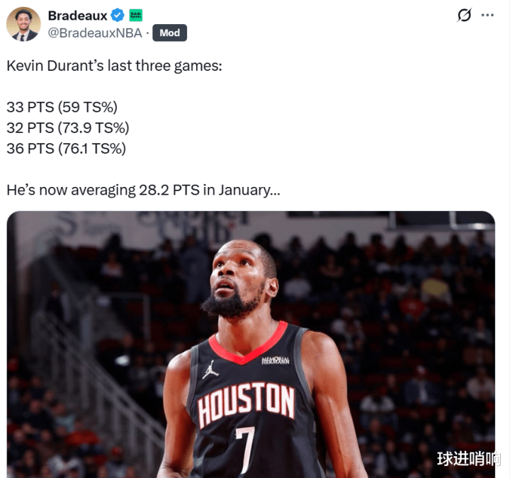 这亦然杜兰特火爆景色的缩影,往时3场比赛杜兰特场均鏖战40.6分钟,贯串三场交出30+得分推崇,场均鄙俚轰下33.7分7.3板2.7助,三项掷中率54.7/50.0/81%,一月份于今场均拿下28.2分。