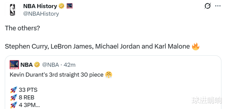 同期本场是杜兰特在生计18个赛季第17次砍下30+,持续高居NBA历史第一,远超第二名詹姆斯的9次与第三名马尔卡龙的7次。