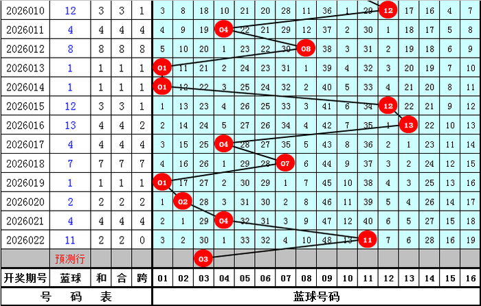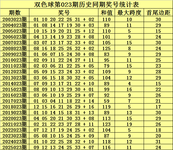 最大跨度推选:在第023期历史同时开奖中,红球最大跨度一齐在4-19之间开出,本年同时重视低位最大跨度出现,参考最大跨度8。