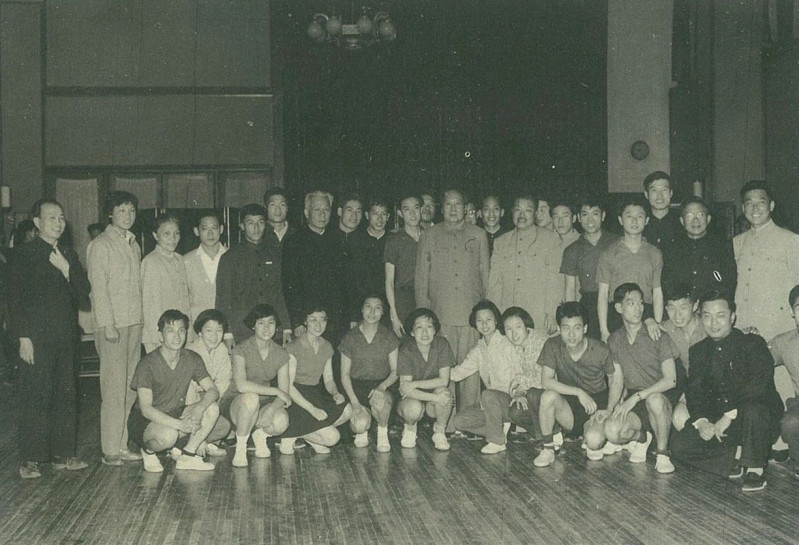 1959年5月,毛泽东、刘少奇、贺龙接见容国团(二排右七)等优秀通顺员。图片起原于广州体育学院容国团专题网站