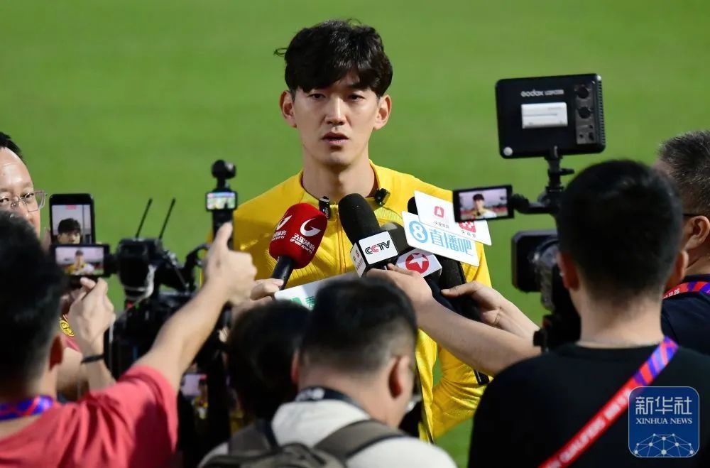 中国队守门员颜骏凌罗致媒体采访。新华社记者 魏培全 摄